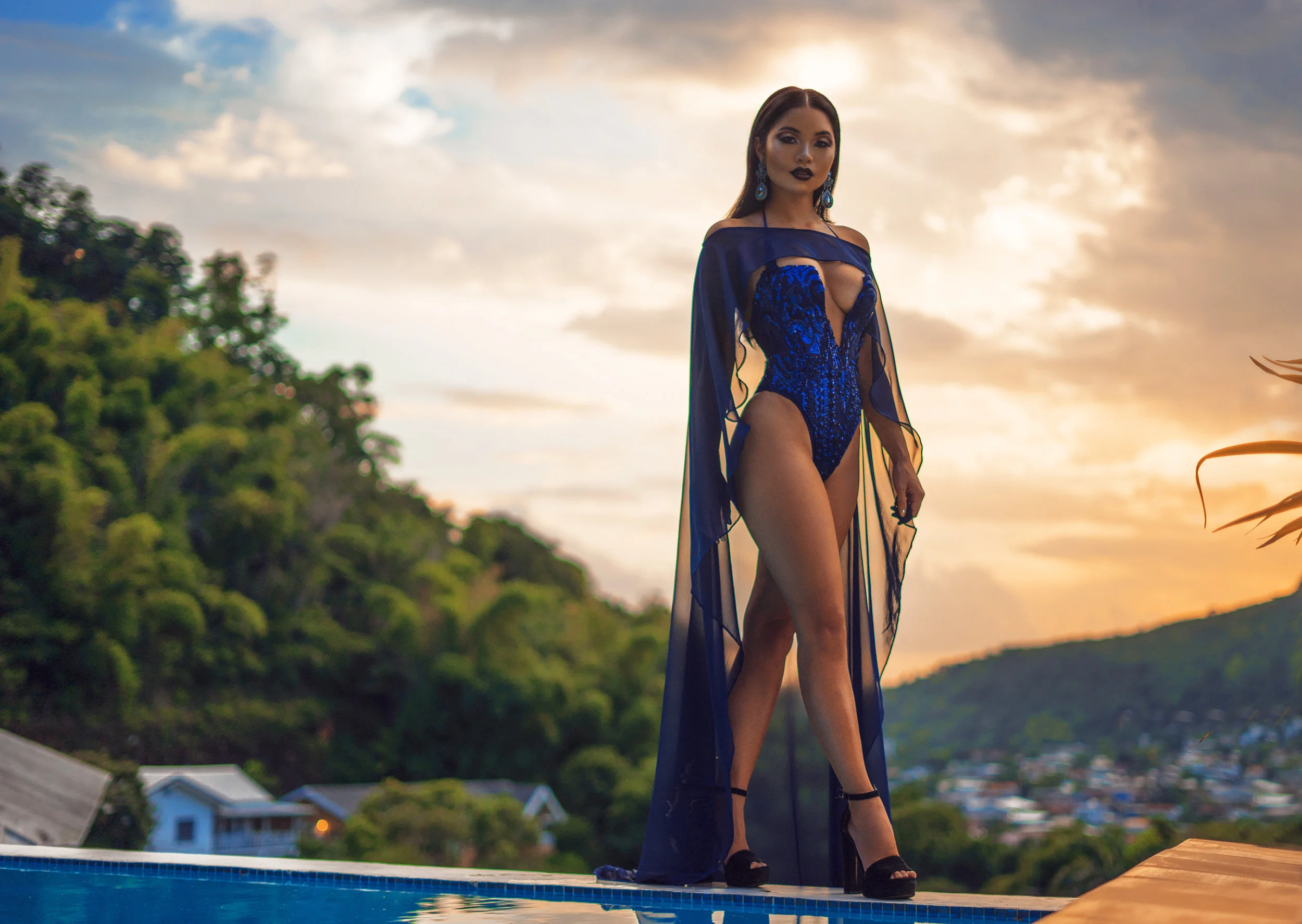 Blue one piece with built in wire bra and cape $1525.00 TT